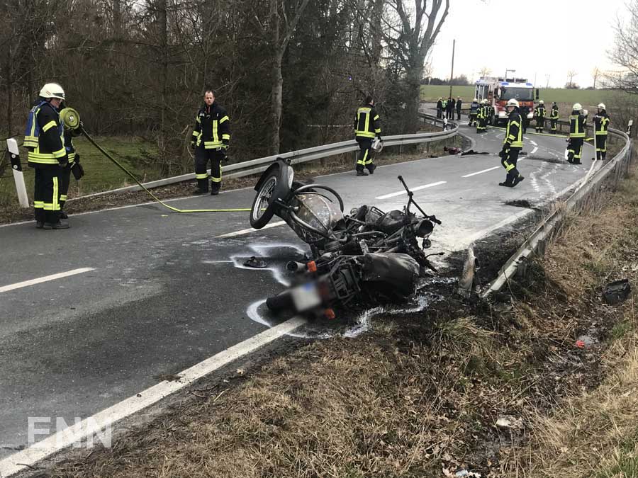 Am Sonntag um 13.30 Uhr wurden Feuerwehr und Rettungsdienst zu einem schweren Verkehrsunfall auf der Landesstraße 792 zwischen Ennigerloh und Oelde gerufen. Dort waren in einer scharfen Kurve zwei Kradfahrer zusammengeprallt. Eine Person zog sich dabei tödliche Verletzungen zu, eine zweite Person wurde schwerst verletzt. Durch den Zusammenprall gerieten beide Motorräder in Brand. Durch die Einsatzkräfte der Feuerwehr wurde das Feuer gelöscht und der Rettungsdienst unterstützt. Gleichzeitig übernahm die Feuerwehr die Absicherung der Unfallstelle sowie die Unterstützung der Polizei bei der Unfallaufnahme und den Aufräumarbeiten. Die schwerstverletzte Person wurde mit dem Rettungshubschrauber Christoph 8 in eine Gelsenkirchener Spezialklinik eingeliefert. Mehrere unverletzte Augenzeugen wurden durch ein Team zur psychosozialen Notfallversorgung zunächst an der Unfallstelle und anschließend im Feuerwehrgerätehaus Hoest betreut. Im Einsatz befanden sich die Löschzüge Hoest und Ennigerloh mit zusammen neun Fahrzeugen, drei Rettungswagen aus Ennigerloh, Oelde und Warendorf, zwei Notärzte aus Oelde und Warendorf sowie der Rettungshubschrauber Christoph 8 aus Lünen. Zusätzlich wurden der Leitende Notarzt sowie der Organisatorische Leiter Rettungsdienst des Kreises Warendorf zur Unfallstelle beordert. Zur Unterstützung der Polizei bei der Unfallaufnahme wurde die Fernmeldeeinheit des Kreises Warendorf mit einer Drohne nachalarmiert. Während der Rettungs- und Aufräumarbeiten wurde die Straße vollständig gesperrt.POL-WAF: Oelde. Motorradfahrer bei Verkehrsunfall tödlich verletzt