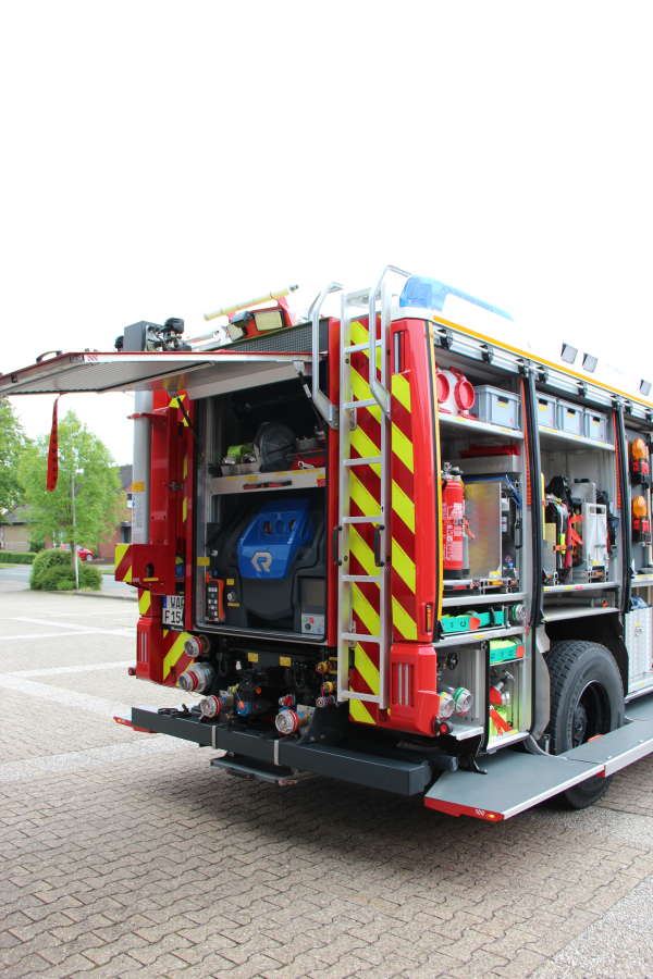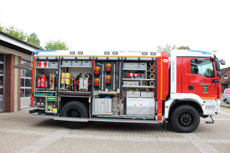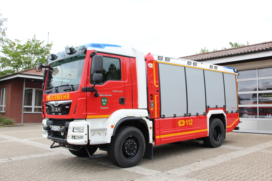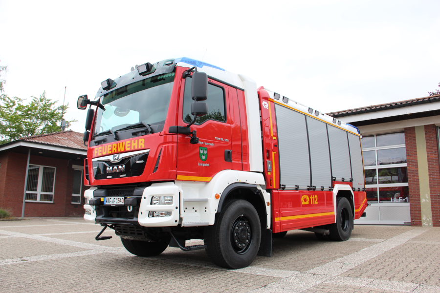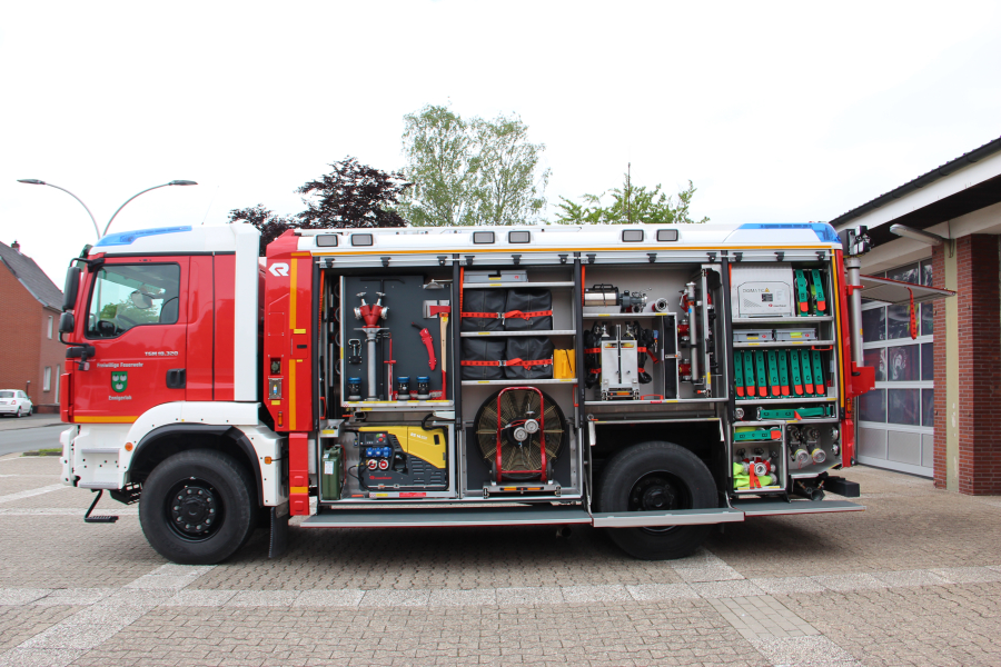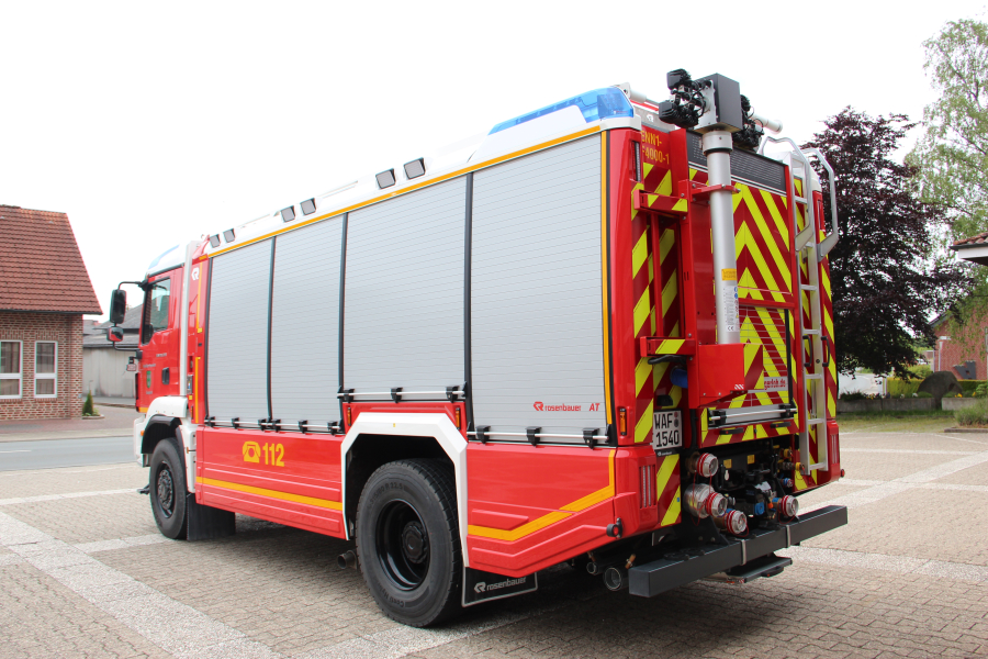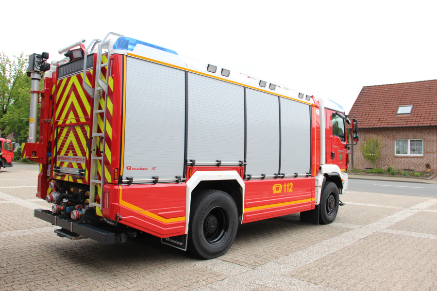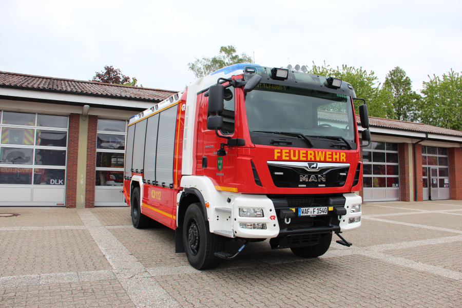 Es ist weit mehr als ein fahrbarer Wassereimer… Das derzeit neueste und größte Fahrzeug am Standort Ennigerloh bringt auch noch reichlich wichtige Gerätschaften mit. Die Rede ist natürlich vom Tanklöschfahrzeug 4000. An Bord hat es 5.000 Liter Löschwasser und 500 Liter Schaummittel, die unter anderem über einen Werfer auf dem Dach, den sogenannten Dachmonitor abgegeben werden können. Es führt aber auch Atemschutzgeräte, Hitzeschutzkleidung, Gerätschaften zur Bekämpfung von Wald- und Flächenbränden, einen Stromerzeuger, einen wasserbetriebenen Überdrucklüfter sowie eine tragbare Pumpe für Hochwassereinsätze mit und ist damit universell einsetzbar. Gebaut wurde das Fahrzeug im Jahr 2021 von der Firma Rosenbauer.