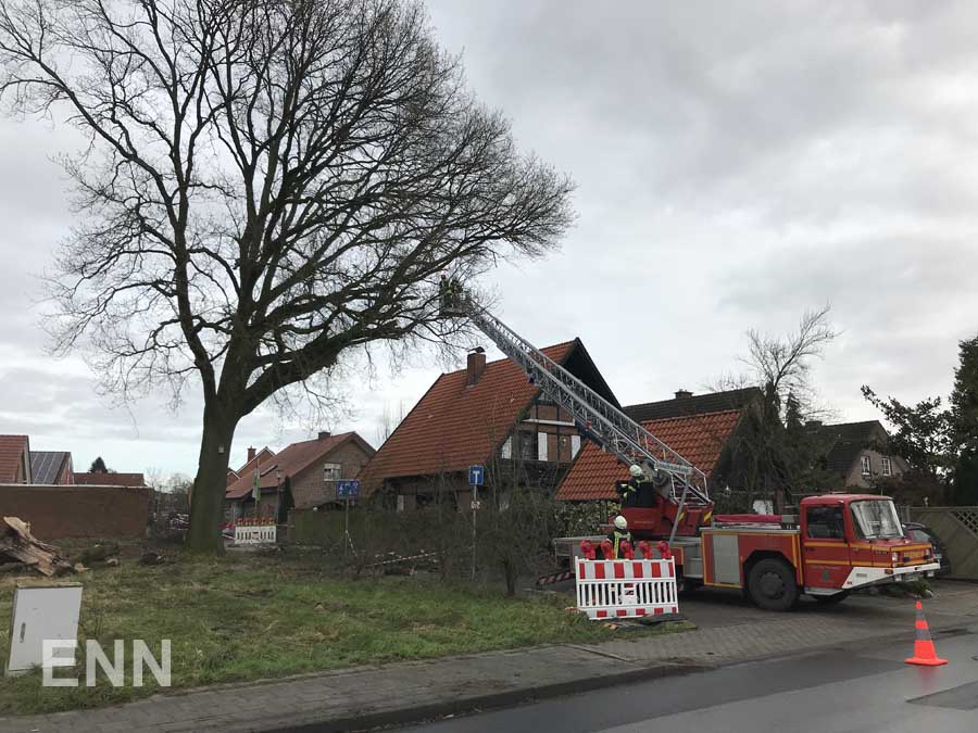 Um 11.02 Uhr am Samstag rückte der Löschzug Enniger zur Vorhelmer Straße aus. Dort drohten mehrere große Äste aus einem Baum auf ein benachbartes Gebäude zu stürzen. Mit Hilfe der hinzugezogenen Drehleiter wurden die Äste entfernt und die Gefahr beseitigt.