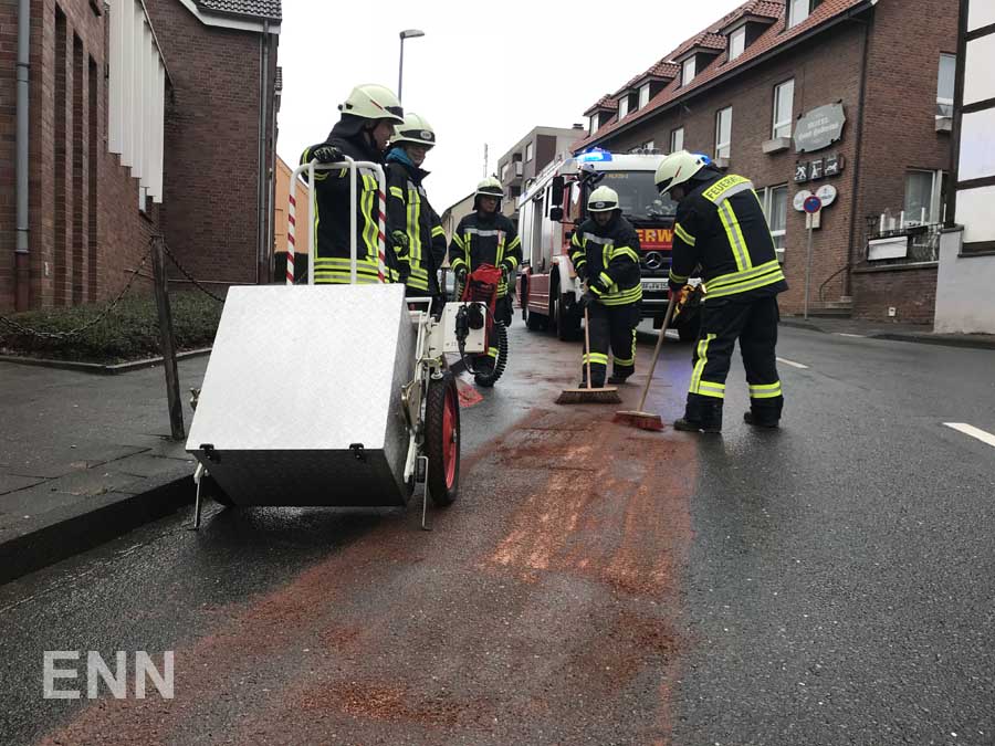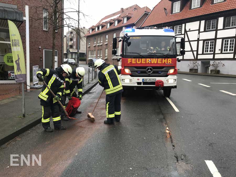 Um 10.40 Uhr rückte auch der Löschzug Ennigerloh zur Beseitigung einer Ölspur aus, die sich über mehrere Straßen im Stadtgebiet erstreckte. Die akuten Gefahrenpunkte wurden abgestreut, für die komplette Beseitigung der rund 2,5 km langen Ölspur wurde eine Fachfirma hinzugezogen