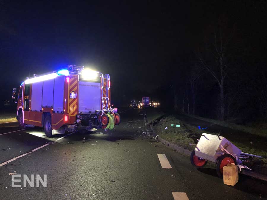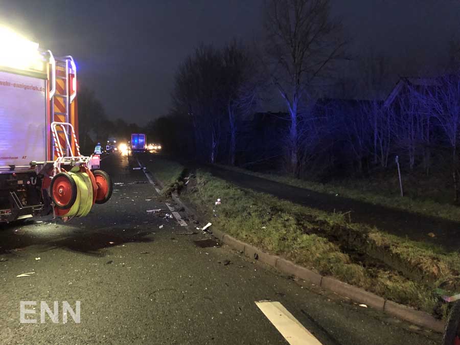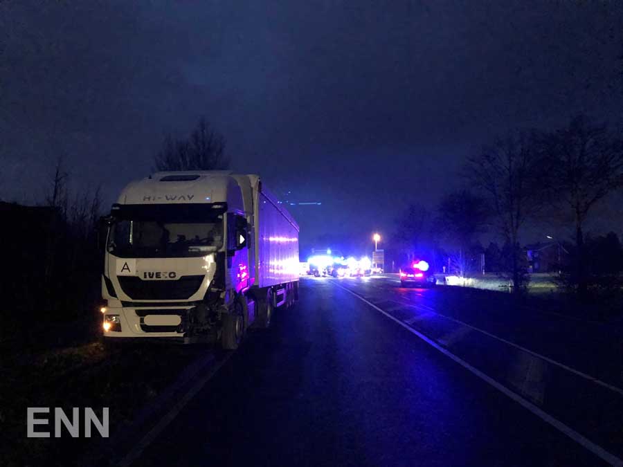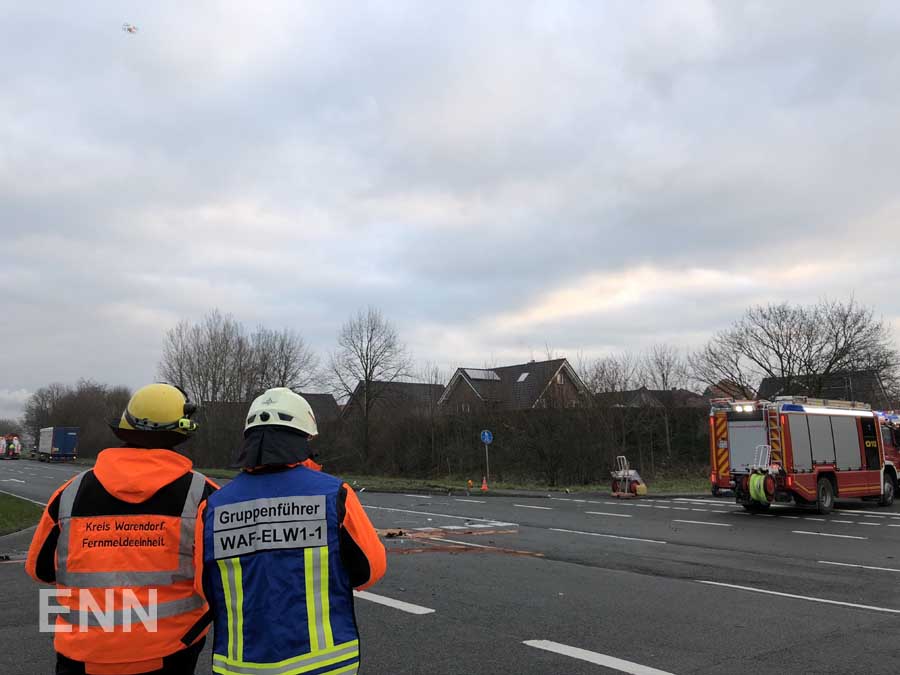 Am Montagmorgen ereignete sich im Kreuzungsbereich Westring / Zum Buddenbaum in Ennigerloh ein Verkehrsunfall, an dem zwei PKW und ein LKW beteiligt waren. Der Löschzug Ennigerloh wurde gemeinsam mit dem Rettungsdienst um 06.54 Uhr zum Einsatz gerufen. Durch die Einsatzkräfte der Feuerwehr wurde die Unfallstelle abgesichert und der Rettungsdienst unterstützt. Die beiden verletzten PKW-Fahrerinnen wurden durch den Rettungsdienst in die Krankenhäuser Warendorf und Oelde eingeliefert, der LKW-Fahrer blieb unverletzt. Vor Ort befanden sich der Löschzug Ennigerloh mit fünf Fahrzeugen und 16 Einsatzkräften, die Rettungswagen aus Ennigerloh und Oelde sowie der Notarzt aus Warendorf. Zur Unterstützung der Polizei bei der Unfallaufnahme wurde die Fernmeldeeinheit des Kreises Warendorf mit einem Fahrzeug und zwei Einsatzkräften nachgefordert. Von diesen Einsatzkräften wurden Luftaufnahmen mittels einer Drohne aufgenommen. Während der Unfallaufnahme und der Bergungsarbeiten wurde die Unfallstelle vollständig gesperrt. Nach der Bergung der verunfallten Fahrzeuge wurde die Fahrbahn durch eine Fachfirma gereinigt.Zu einer Gefährdung der Einsatzkräfte kam es während der Erstmaßnahmen, als ein PKW-Fahrer aus Richtung Westkirchen eigenmächtig über den Grünstreifen und den Radweg auswich und versuchte, die Unfallstelle zu passieren. Die hier tätigen Kräfte konnten nur knapp einem Zusammenstoß entgehen.