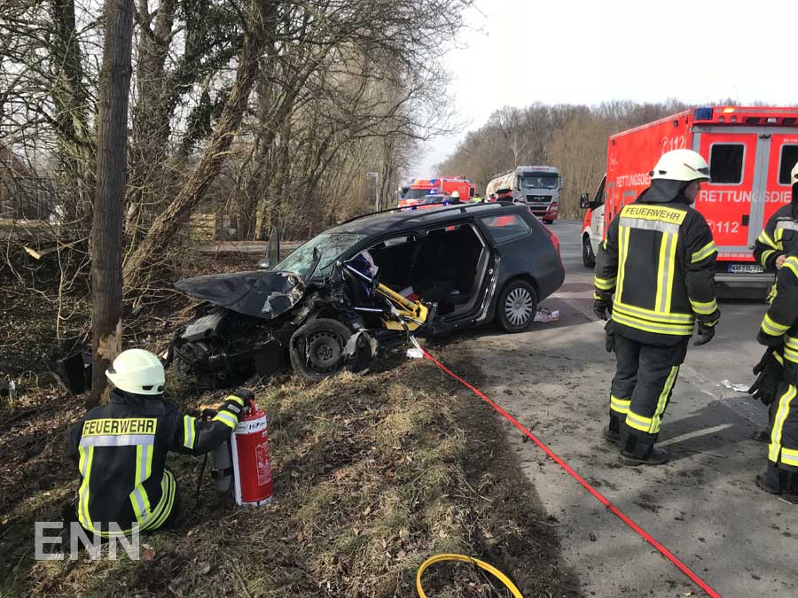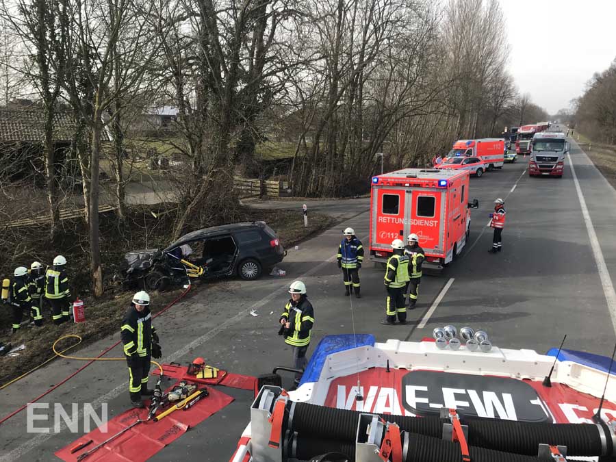 Am Dienstag um 13.25 Uhr wurden Feuerwehr und Rettungsdienst zu einem Verkehrsunfall auf der Bundesstraße 475 zwischen Westkirchen und Warendorf gerufen. Dort war eine PKW-Fahrerin mit ihrem Fahrzeug von der Fahrbahn abgekommen und gegen einen Baum geprallt. Die eingeklemmte Fahrerin wurde durch die Feuerwehr mit hydraulischen Rettungsgeräten aus ihrem Fahrzeug befreit und vom Rettungsdienst in eine Münsteraner Klinik eingeliefert. Im Einsatz befanden sich die Löschzüge Westkirchen und Ennigerloh mit insgesamt vier Fahrzeugen, zwei Rettungswagen aus Ennigerloh und Warendorf sowie der Notarzt aus Warendorf. Ein vorsorglich angeforderter Rettungshubschrauber war nicht erforderlich und konnte den Einsatz abbrechen. Während der Rettungs- und Aufräumarbeiten wurde die Unfallstelle durch die Feuerwehr abgesichert, die Bundesstraße war währenddessen vollständig gesperrt.