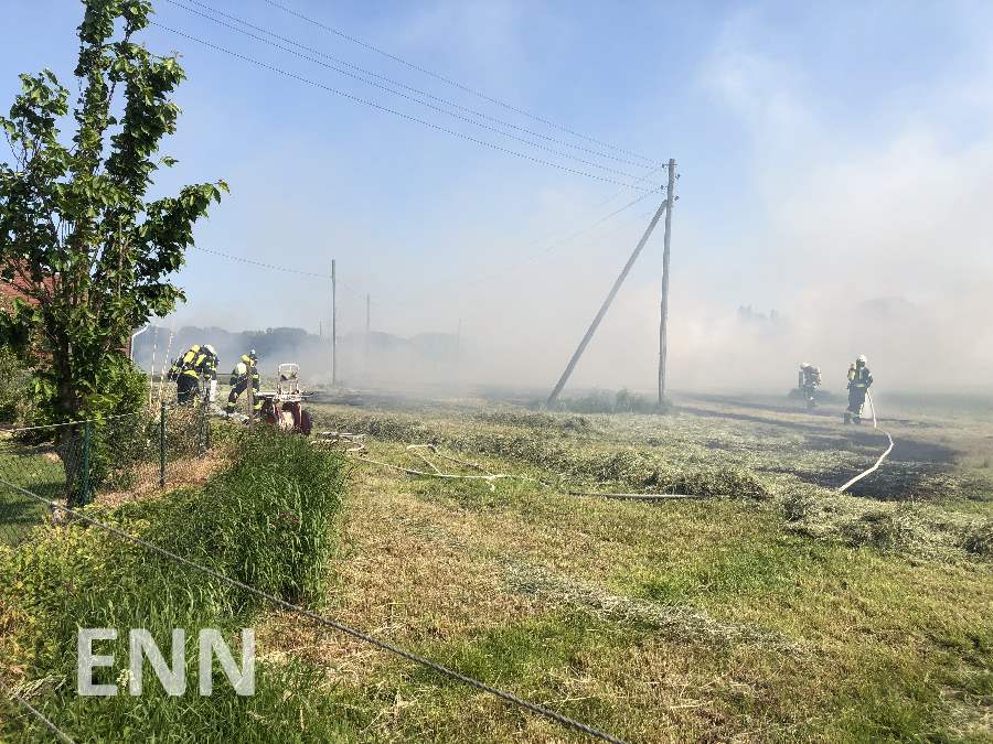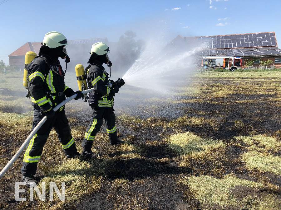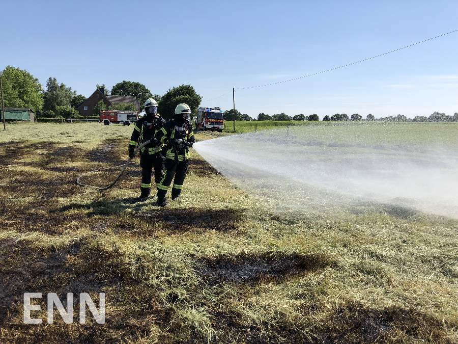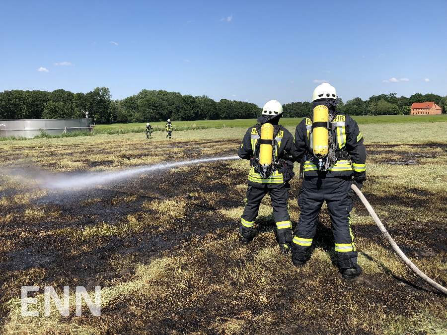 Am Sonntag um 14.52 Uhr wurde die Feuerwehr zu einem Flächenbrand am Letter Weg in Ostenfelde gerufen. Dort war Heu auf einer Fläche von rund 2.000 Quadratmetern in Brand geraten. Das Feuer breitete sich in Richtung der angrenzenden Hofstelle aus. Durch die zuerst eintreffenden Kräfte des Löschzuges Ostenfelde wurden umgehend weitere Kräfte nachgefordert. Zum Einsatz kamen so die Löschzüge Ostenfelde, Ennigerloh, Westkirchen, Hoest und Beelen mit insgesamt 15 Fahrzeugen, hinzu kam der Rettungswagen aus Ennigerloh. Die Einsatzkräfte konnten durch einen gezielten Löschangriff eine weitere Ausbreitung des Feuers erfolgreich verhindern. Aufgrund der Rauchentwicklung wurden die Löscharbeiten unter schwerem Atemschutz durchgeführt. Personen kamen glücklicherweise nicht zu Schaden. Gegen 17.15 Uhr konnte der Einsatz beendet werden