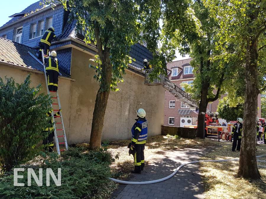 Ein Feuer an der Bahnhofstraße beschäftigte den Löschzug Ennigerloh am Samstagmittag. Um 13.07 Uhr wurden die Einsatzkräfte zur Bahnhofstraße gerufen. Dort sollte es in einer Dachrinne brennen. Bei Eintreffen der ersten Kräfte drohte sich der Brand auf den Dachbereich auszubreiten, Teile der Dachsparren sowie der Isolierung waren bereits in Mitleidenschaft gezogen worden. Die Einsatzkräfte gingen unter Atemschutz zur Brandbekämpfung vor. Dabei kam auch die Drehleiter zum Einsatz, um Teile des Dachüberstands zu öffnen und sicherheitshalber mit der Wärmebildkamera zu kontrollieren. Durch das schnelle Eingreifen konnte größerer Schaden verhindert werden. Personen kamen nicht zu Schaden. Im Einsatz befand sich der Löschzug Ennigerloh mit 25 Kräften und fünf Fahrzeugen, hinzu kam der Rettungswagen der Rettungswache Ennigerloh. Um 14.13 Uhr konnte der Einsatz beendet werden.
