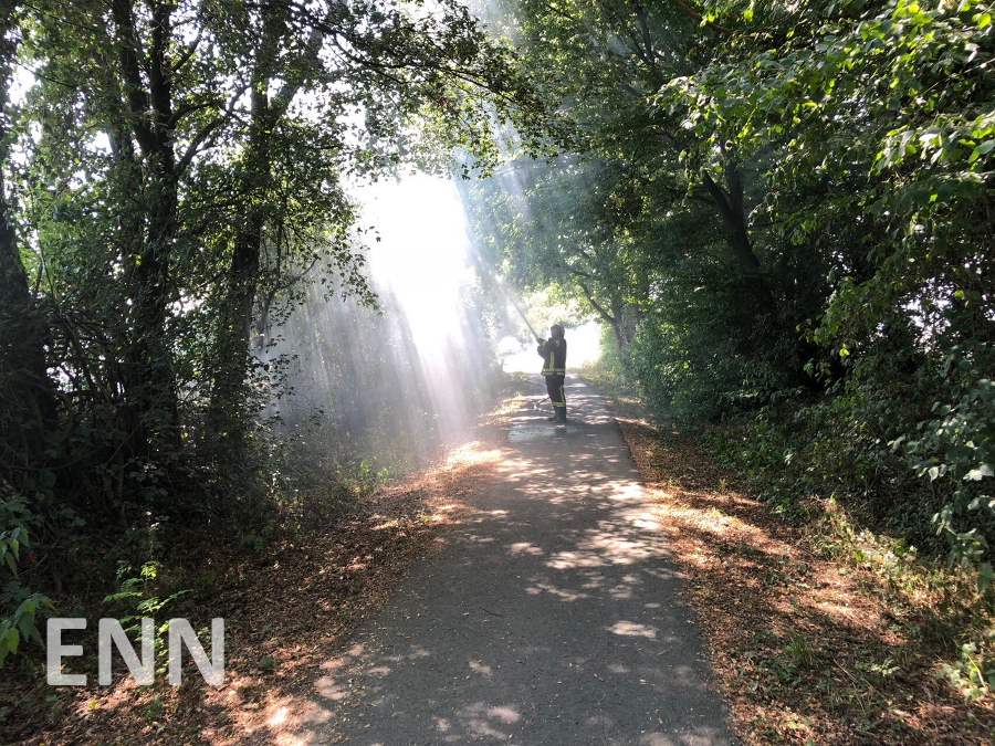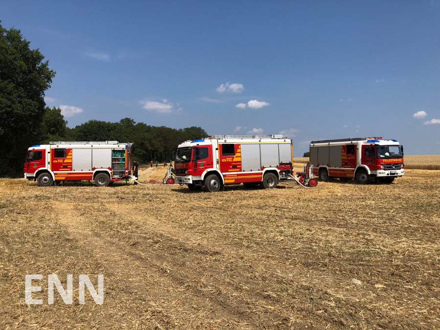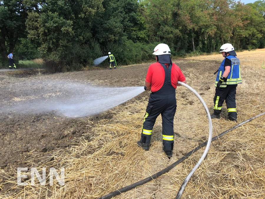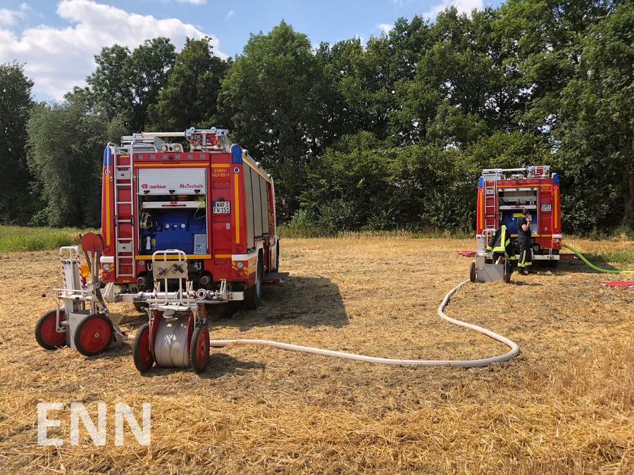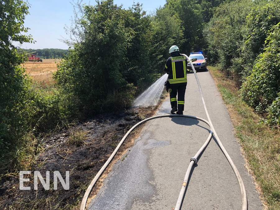 Ein Flächenbrand in der Nähe des Clemens-Ruhe-Weges zwischen Westkirchen und Ennigerloh beschäftigte die Feuerwehr am Donnerstagmittag. Um 11.51 Uhr rückten die Einsatzkräfte zum Clemens-Ruhe-Weg aus. Bevor die Einheiten aus Westkirchen, Ennigerloh und Ostenfelde die Brandstelle erreicht hatten, wurde durch einen Landwirt der angrenzende Acker soweit abgeerntet, dass eine Zufahrt für die Feuerwehr über die Ackerfläche möglich war und sich das Feuer nicht auf das Getreide ausbreiten konnte. Nachdem die Ackerfläche sowie die Böschung am nahegelegenen Radweg abgelöscht waren, wurde das Feld durch den Landwirt umgebrochen. Im Einsatz befanden sich sieben Fahrzeuge der Feuerwehr sowie der Rettungswagen der Rettungswache Ennigerloh. Personen kamen glücklicherweise nicht zu Schaden. Gegen 13.40 Uhr konnte der Einsatz beendet werden. Um 14.18 Uhr rückte der Löschzug Westkirchen nochmals zu kleineren Nachlöscharbeiten aus.