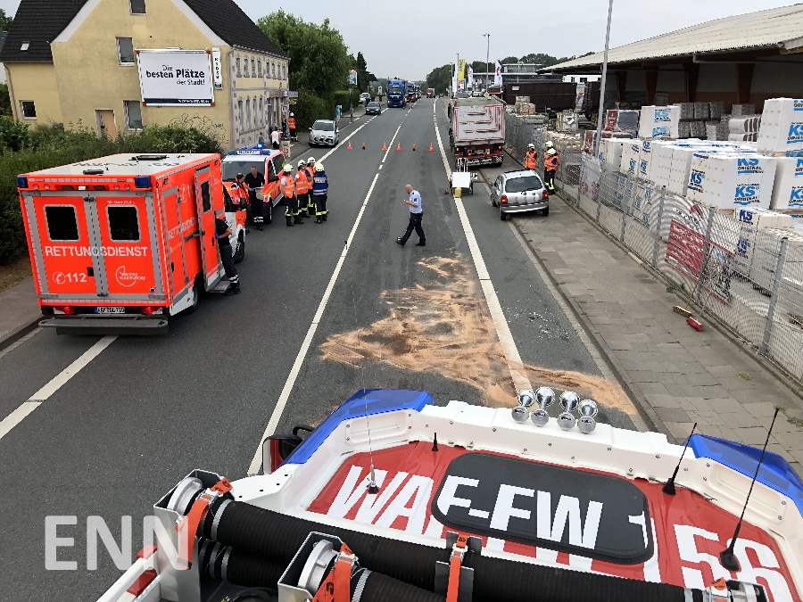 Am Donnerstagmorgen ereignete sich auf der Neubeckumer Straße in Ennigerloh ein Auffahrunfall zwischen einem PKW und einem LKW. Feuerwehr und Rettungsdienst wurden um 08.42 Uhr zum Einsatz gerufen. Die verletzte PKW-Fahrerin wurde in das Krankenhaus Beckum eingeliefert, der LKW-Fahrer wurde durch den Rettungsdienst untersucht, brauchte jedoch keinem Krankenhaus zugeführt zu werden. Die Einsatzkräfte der Feuerwehr sicherten die Unfallstelle ab und beseitigten ausgelaufene Betriebsstoffe. Während der Rettungs- und Aufräumarbeiten wurde die Bundesstraße 475 zwischen Ennigerloh und Neubeckum vollständig gesperrt. Im Einsatz befanden sich der Löschzug Ennigerloh mit vier Fahrzeugen und 16 Kräften, zwei Rettungswagen aus Ennigerloh und Oelde sowie der Notarzt aus Beckum. Gegen 09.50 Uhr wurde der Einsatz beendet.Warendorf (ots) - Am Donnerstag, 9.8.2018, fuhr eine Fahrzeugführerin gegen 8.40 Uhr auf der Neubeckumer in Ennigerloh auf einen Lkw auf. Der 27-jährige Fahrer des Lkw-Gespanns musste wegen eines parkenden Kastenwagens und Gegenverkehr anhalten. Die Beckumerin bemerkte die Situation zu spät, so dass es zu dem Zusammenstoß kam. Hierbei verletzten sich die 19-Jährige und der Olfener leicht. Rettungskräfte brachten die Fahranfängerin zur weiteren ärztlichen Behandlung in ein Krankenhaus. Das Auto wurde abgeschleppt und die Straße für Reinigungsarbeiten wegen auslaufender Begetriebsstoffe kurz gesperrt. Bei dem Verkehrsunfall entstand ein Sachschaden von etwa 3.000 Euro.