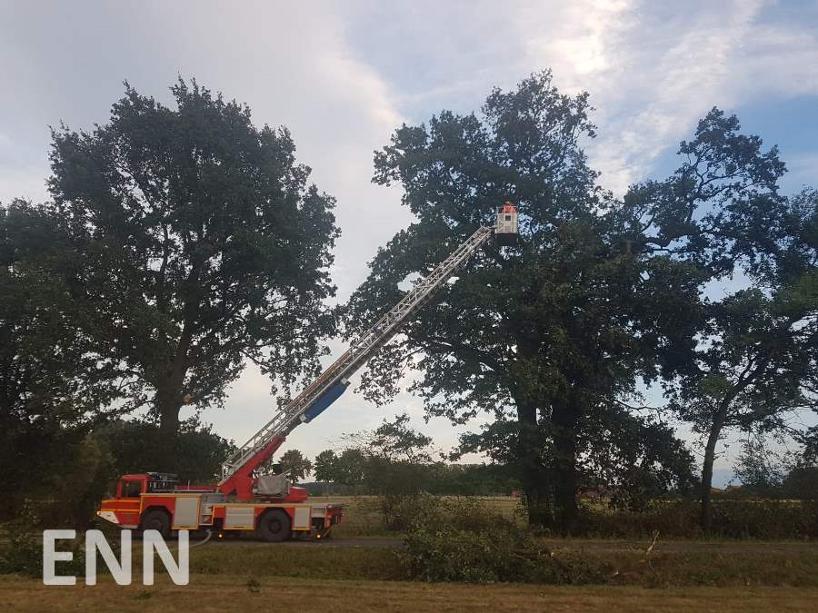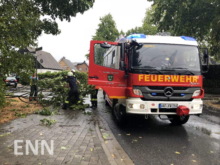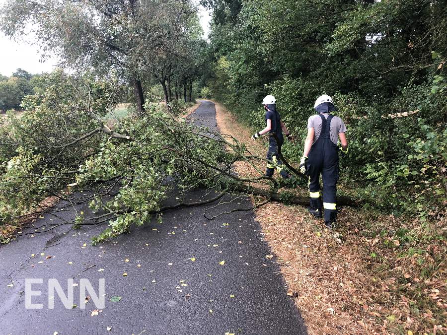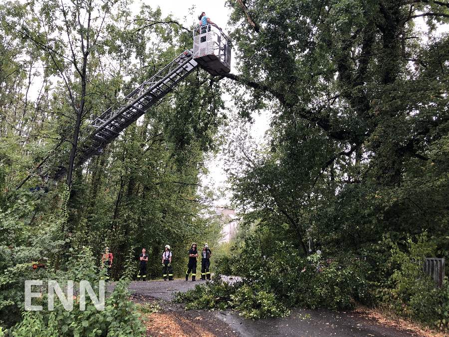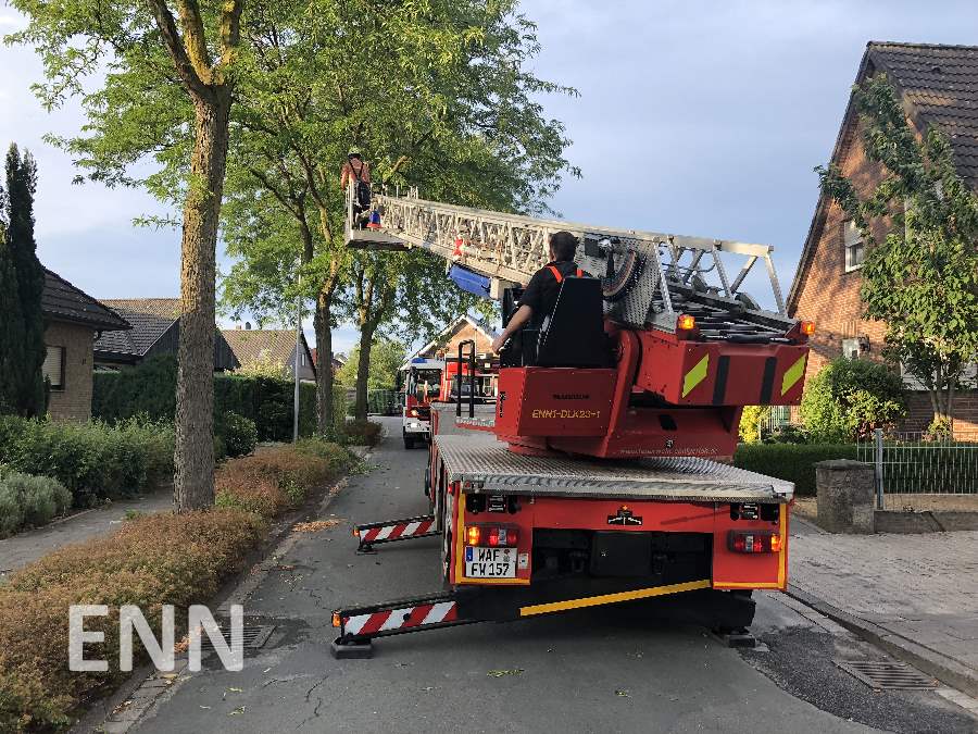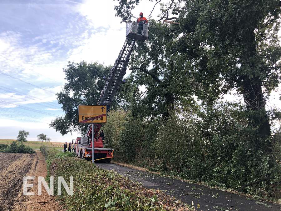 Das Gewittertief „Nadine“ sorgte am Donnerstagabend auch in Ennigerloh für mehrere Feuerwehreinsätze. Um 16.24 Uhr wurde zunächst der Löschzug Westkirchen zum Einsatz gerufen, wenig später auch der Löschzug Ennigerloh sowie im weiteren Verlauf des Abends um 19.50 Uhr auch der Löschzug Ostenfelde. Insgesamt wurden 14 Einsätze verzeichnet, davon zwei im Bereich Westkirchen, elf im Bereich Ennigerloh sowie eine Einsatzstelle in Ostenfelde. In allen Fällen handelte es sich um abgeknickte und abgerissene Äste, Bäume und Baumkronen. Teilweise drohten diese auf Fahrbahnen und Gehwege zu stürzen und mussten mit Hilfe der Drehleiter entfernt werden. Mehrere Einsatzstellen wurden durch den Bereitschaftsdienst der Stadt Ennigerloh abgesperrt und im Nachgang bearbeitet. Die Koordination der Einsätze im Bereich der Stadt Ennigerloh erfolgte nach einem kreisweiten Konzept über den Einsatzleitwagen am Feuerwehrgerätehaus Ennigerloh. Personen kamen bei allen Einsätzen glücklicherweise nicht zu Schaden. Gegen 22.00 Uhr konnten die letzten Kräfte den Einsatz beenden.