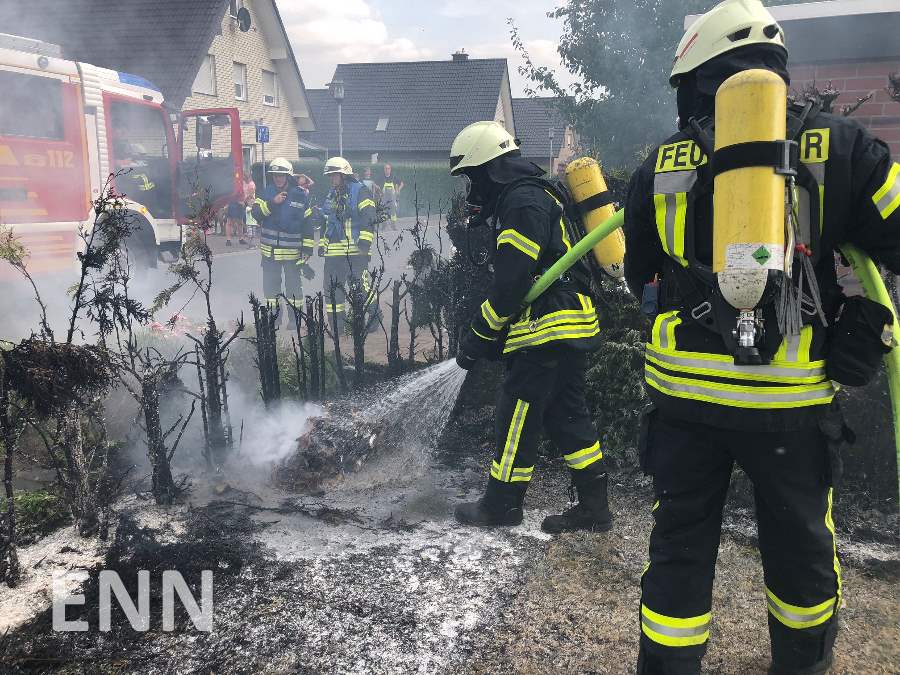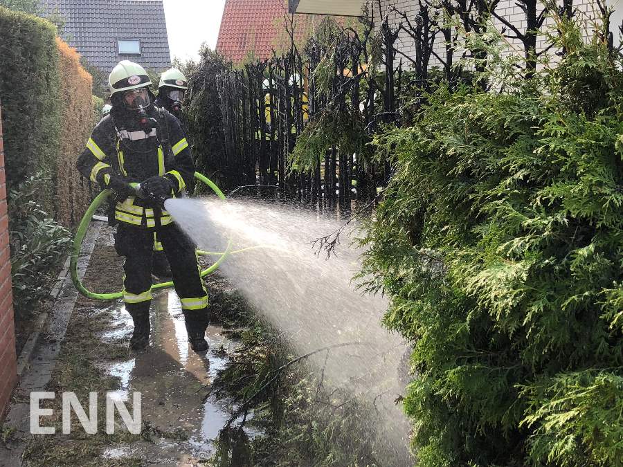 Ein Heckenbrand an der Georg-Friedrich-Händel-Straße sorgte am Dienstag für einen Einsatz der Feuerwehr. Um 15.57 Uhr wurden die Löschzüge Ennigerloh, Westkirchen und Hoest alarmiert. Bei Eintreffen der ersten Kräfte brannte eine Hecke auf einer Länge von rund 20 Metern in voller Ausdehnung. Durch die Hitzestrahlung waren bereits Teile des nebenstehenden Gebäudes beschädigt worden. Die Einsatzkräfte konnten den Brand in kurzer Zeit unter Kontrolle bringen und so eine weitere Brandausbreitung erfolgreich verhindern. Das Gebäude wurde vorsorglich mit einer Wärmebildkamera kontrolliert. Personen kamen glücklicherweise nicht zu Schaden.