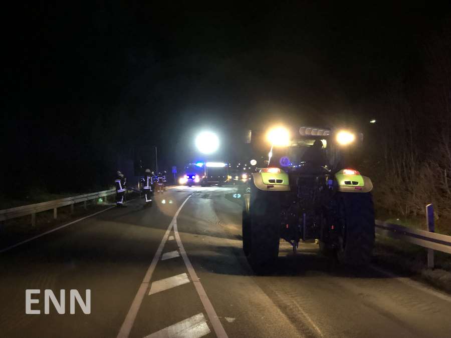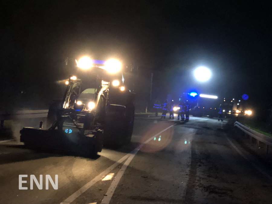 In der frühen Mittwochnacht um 00.32 Uhr wurde der Löschzug Ennigerloh alarmiert, um die Fahrbahn der B 475 für die Polizei zu reinigen.Ein LKW war zuvor auf die Bankette abgekommen und verunreinigte so großflächig die Fahrbahn mit Erdreich. Erste Versuche die Fahrbahn mit Schaufel und Besen zu reinigen, stellten sich als sehr zeitintensiv dar. Glücklicherweise kann die freiwillige Feuerwehr aber auf eine Großzahl von unterschiedlichen Fähigkeiten zurück greifen, sodass ein Landwirt aus den eigenen Reihen mittels Trecker und Besen die Straße schnell vom Erdreich befreien konnte. Danke dafür!