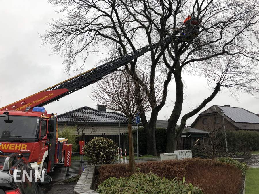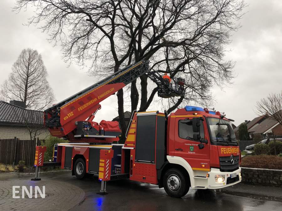 Am Freitag um 15.44 Uhr rückte der Löschzug Ennigerloh zum Hoester Weg aus. Dort drohten Äste aus einem Baum auf die Fahrbahn zu stürzen. Mit Hilfe der Drehleiter wurden die Äste entfernt.