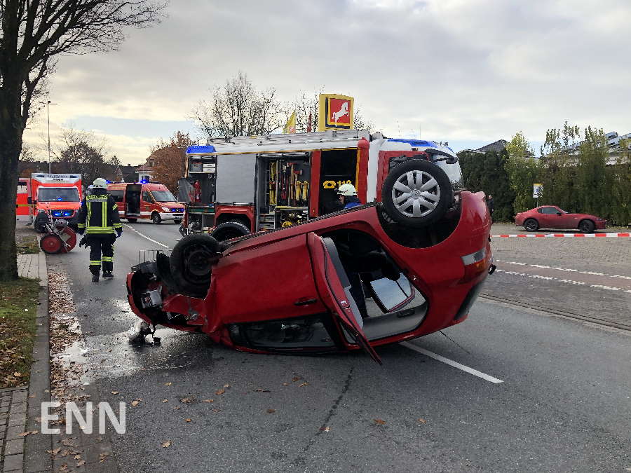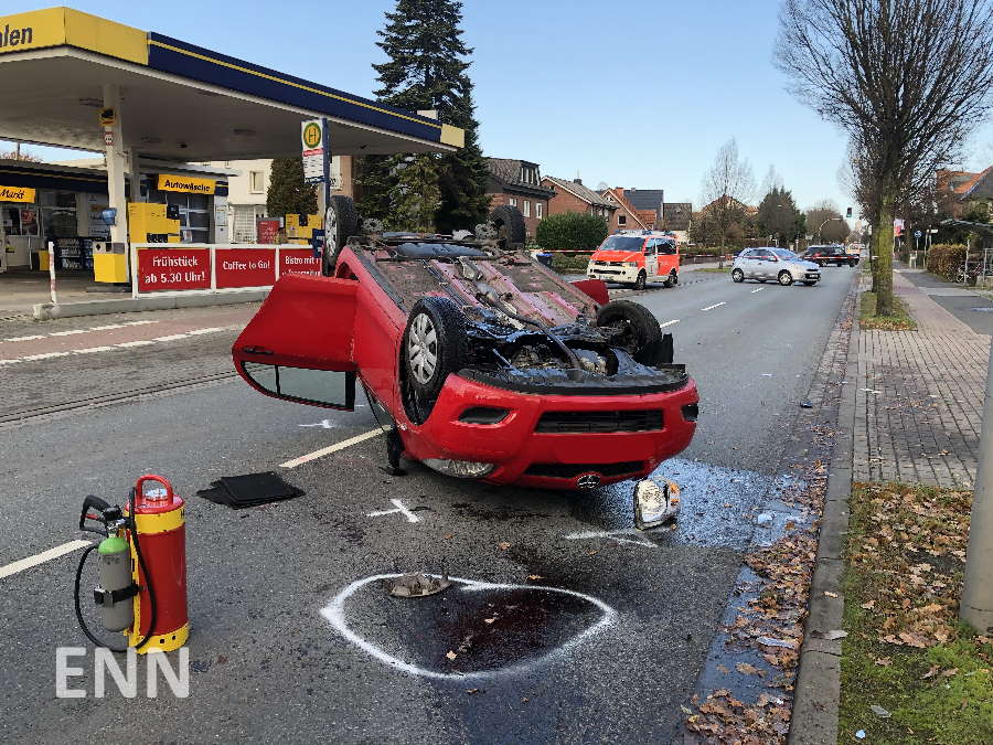 Gegen 11.15 Uhr ereignet sich ein folgenschwerer Unfall auf der Westkirchener Straße in Ennigerloh. Eine 71-jährige Frau aus Ennigerloh befuhr mit ihrem Kleinwagen die Westkirchener Straße stadtauswärts. Aus bisher unbekannter Ursache kam die Frau mit ihrem Fahrzeug nach rechts von der Fahrbahn und prallte dort gegen einen Baum. Durch die Kollision überschlug sich der PKW und kam auf dem Dach liegend zum Stillstand. Die Fahrzeugführerin und ihr 80-jähriger Beifahrer wurden beim dem Unfall leichtverletzt. Die Westkirchener Straße war für die Dauer der Unfallaufnahme voll gesperrt. An dem Fahrzeug entstand ein erheblicher Sachschaden.