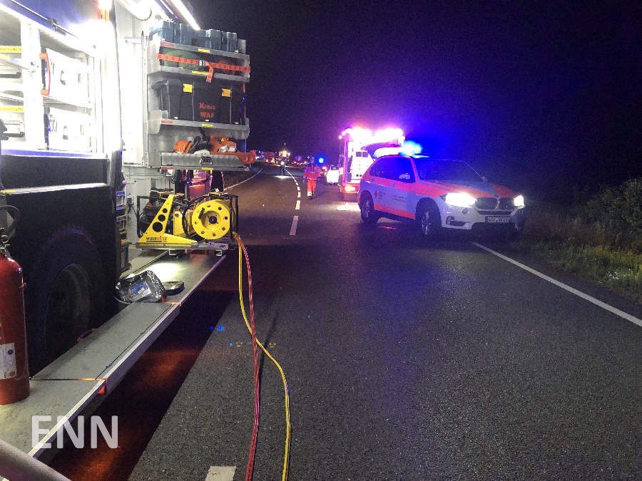 Am Dienstagabend ereignete sich auf der Bundesstraße 475 zwischen Ennigerloh und Westkirchen ein Verkehrsunfall, an dem zwei PKW und ein LKW beteiligt waren. Die Feuerwehr und der Rettungsdienst wurden um 22.20 Uhr zum Einsatz gerufen. An der Unfallstelle befanden sich zwei PKW nach einem Zusammenstoß im Graben, ein am Unfall beteiligter LKW stand auf der Fahrbahn. In einem der Fahrzeuge wurde durch den Unfall eine Person eingeklemmt. Die Feuerwehr setzte zur Personenrettung hydraulische Rettungsgeräte ein. Der Patient wurde nach notärztlicher Behandlung durch den Rettungsdienst der Uniklinik in Münster zugeführt. Die beiden Insassen des zweiten PKW wurden nach rettungsdienstlicher Versorgung in die Krankenhäuser Beckum und Warendorf eingeliefert. Die LKW-Fahrerin blieb unverletzt. Neben der Rettung des eingeklemmten PKW-Fahrers übernahmen die Einsatzkräfte der Feuerwehr die Absicherung und Ausleuchtung der Unfallstelle. Die Bundesstraße 475 musste für mehrere Stunden vollständig gesperrt werden. Im Einsatz befanden sich der Löschzug Ennigerloh mit fünf Fahrzeugen, vier Rettungswagen aus Ennigerloh, Neubeckum und Warendorf, der Notarzt aus Warendorf sowie der Leitende Notarzt und der Organisatorische Leiter Rettungsdienst des Kreises Warendorf. Die letzten Einsatzkräfte der Feuerwehr konnten gegen 02.00 Uhr die Einsatzstelle verlassen.