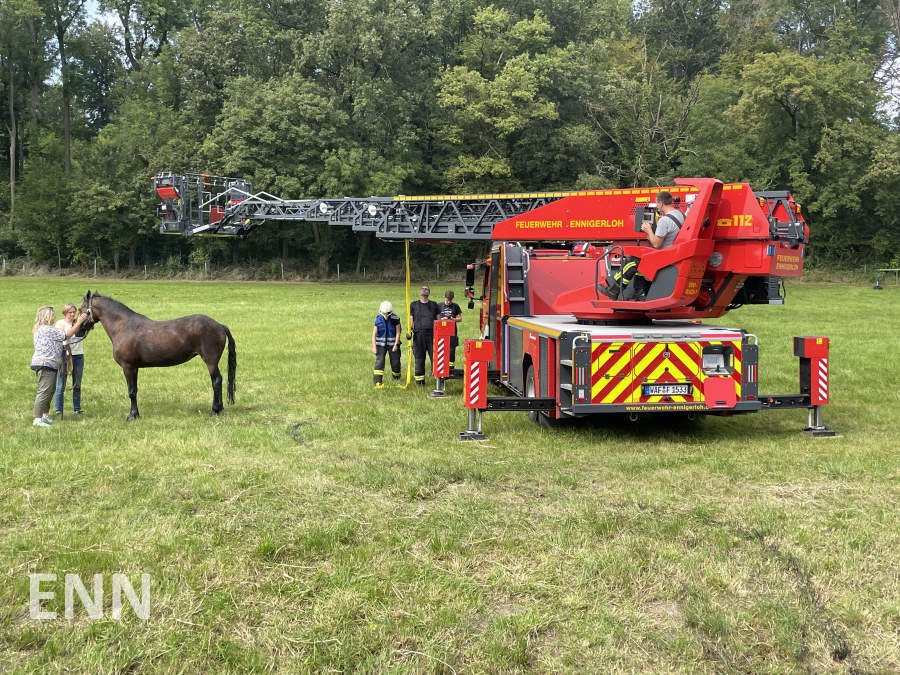 Ungewöhnlicher Einsatz für die Feuerwehr am Montagmittag: Um 12.16 Uhr wurde der Löschzug Ostenfelde zu einer Tierrettung in der Bauerschaft Vintrup gerufen. Dort war ein Pferd in einen Graben gestürzt und konnte sich aus eigener Kraft nicht befreien. Durch eine Tierärztin wurde das Pferd tiermedizinisch versorgt. Zudem wurde die Drehleiter aus Ennigerloh zur Tierrettung nachgefordert. Zusätzlich wurde ein Fachberater für Großtierrettungen aus Oelde-Lette hinzugezogen, der auch seine Ausrüstung zur Verfügung stellte. Mit Hilfe der Drehleiter wurde das Pferd anschließend aus dem Graben gezogen. Augenscheinlich zog es sich bei dem Sturz nur leichte Verletzungen zu, so dass es aus eigener Kraft auf ein nahe gelegenes Hofgelände verbracht werden konnte. Um 14.03 Uhr wurde der Einsatz der Feuerwehr beendet.